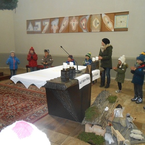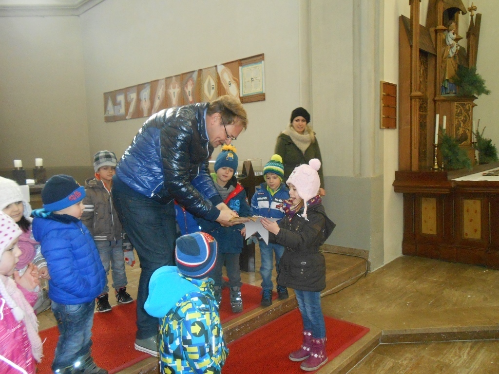 Die blaue, die grüne und die rote Gruppe des Kindergartens Farrach unternahmen jeweils einen Winterspaziergang vom Kindergarten über den Skywalk bis hin zur Krippe am Platzlmarkt. Dort wartete Sarah Knolly auf die Kinder, um ihnen die Weihnachtsgeschichte zu erzählen. Anschließend ging die Wanderung zur Kirche weiter. Beim Besuch der blauen Gruppe kam unser Herr Pfarrer dazu, um den Kindern die Kirche zu zeigen. Vieles wurde erkundet und bestaunt und ganz überrascht stellten die Kinder fest, dass der Herr Pfarrer ja gar nicht in der Kirche wohnt J Gemeinsam wurde „Gottes Liebe ist so wunderbar“ um den Altar gesungen, bevor die Kinder nach Hause gingen. Und jetzt ziert ein hübscher Stern mit den Namen der Kinder den Ambo…