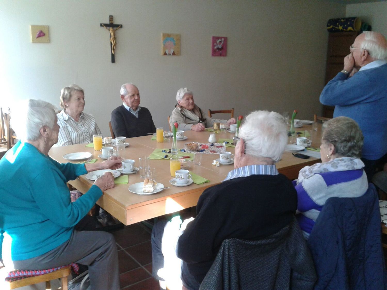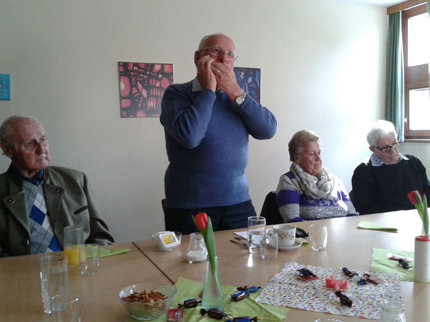 9 Geburtstagskinder zusammen mit Alexandra Schlager, Sepp Leitner und Pfarrer Gerhard Hatzmann in gemütlicher Runde ihren Geburtstag.